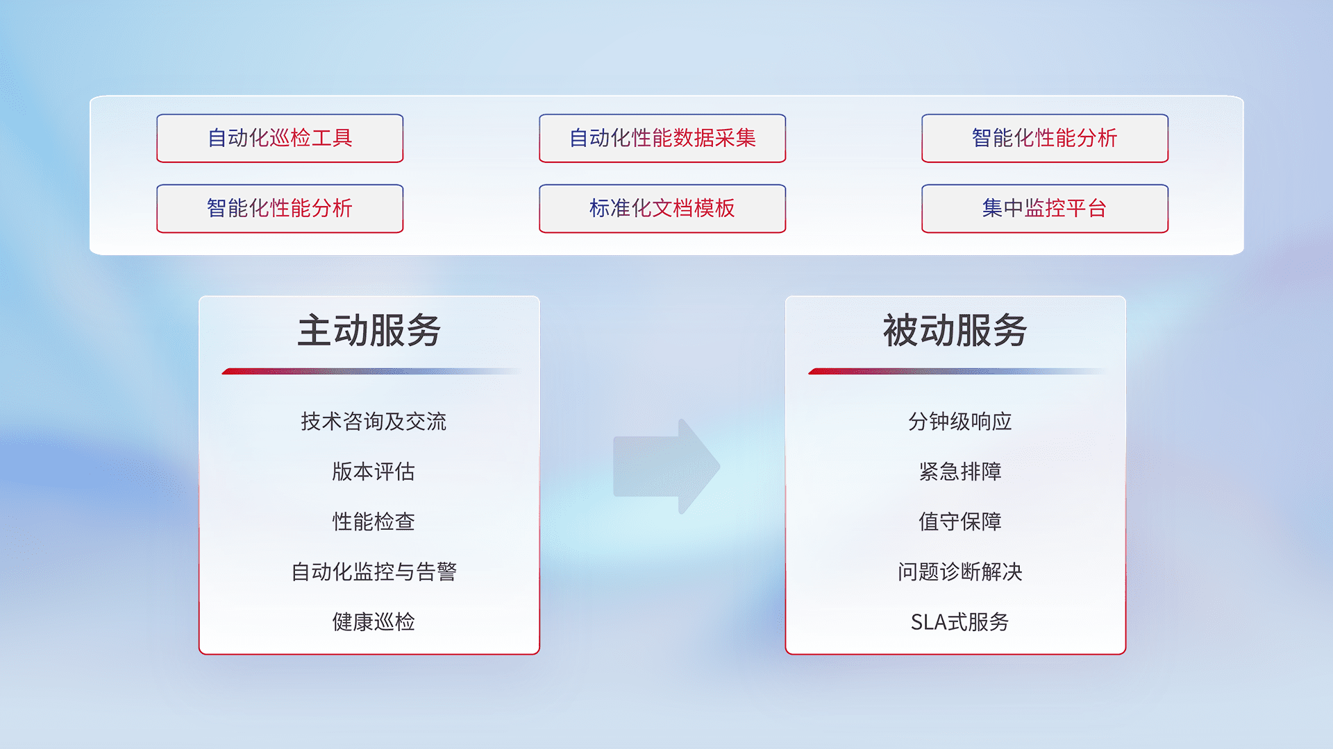 智能化工具和标准化文档,,,,保障服务质量,,提供主动服务(包含技术咨询、、、、版本评估、、、性能检查、、自动化监控与告警、、健康巡检)和被动服务包含(分钟级响应、、、、紧急排障、、、值守保障、、、、问题诊断解决、、、SLA服务)。。。。